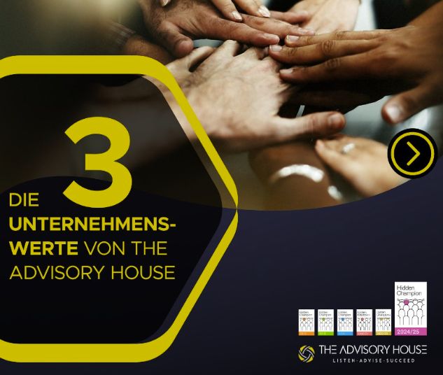Jeder dieser drei Werte nimmt den gleichen Stellenwert in unserem Denken und Handeln ein. Gemeinsam ergeben sie ein positives Ganzes, das zu erfolgreichen Projekten, nachhaltigen Kundenbeziehungen und geschäftlichem Erfolg von The Advisory House führt sowie die Grundlage für einen «Great Place to Work» bildet.