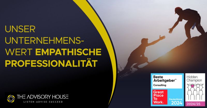 🫂 Empathische Professionalität ist der dritte unserer drei Unternehmenswerte. Zusammen mit den Werten Exzellenz und Bekenntnis zum Kunden bilden sie das Fundament von The Advisory House, das die Verhaltensweisen und Entscheidungsprozesse unseres Unternehmens definiert und leitet.